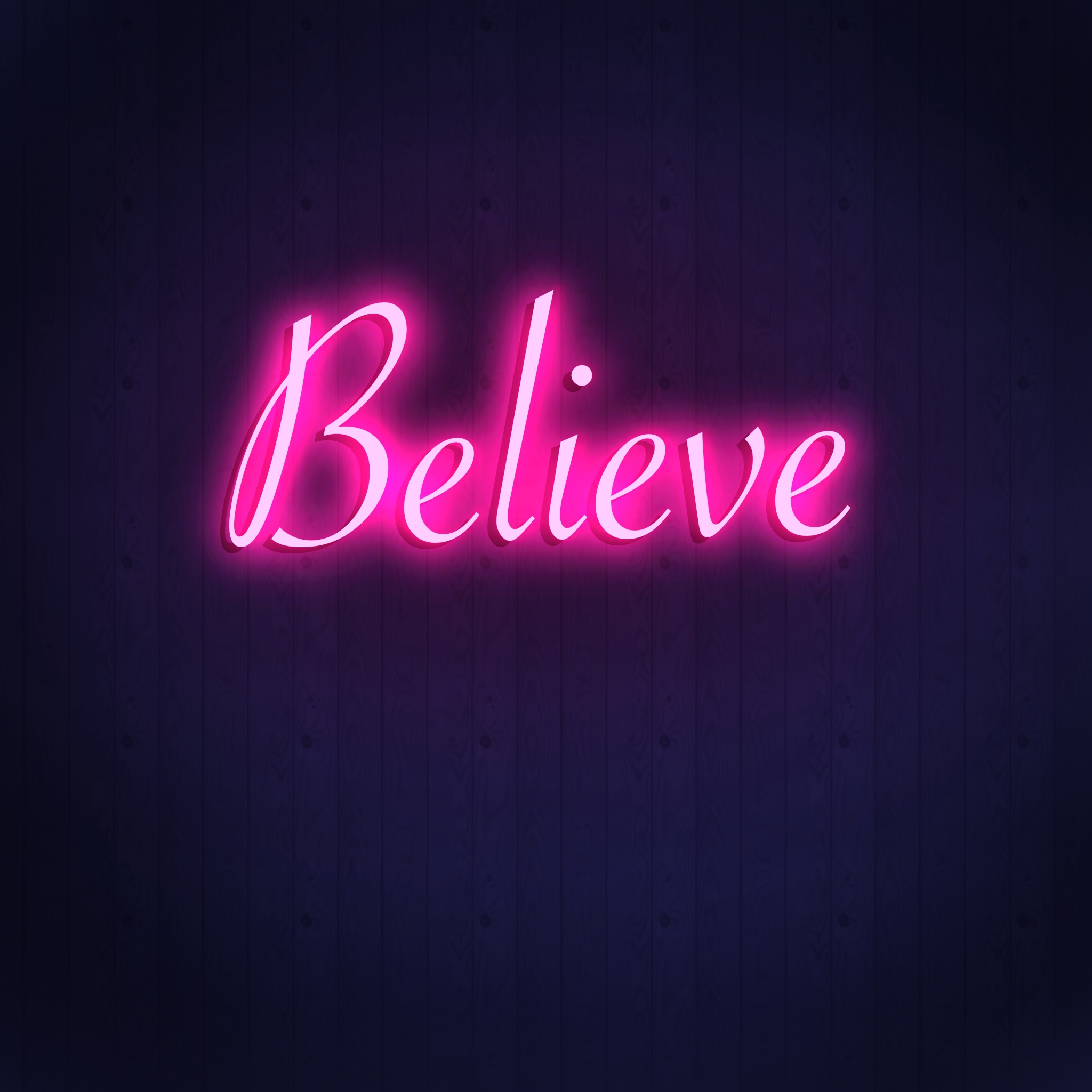 A digital artwork created in Procreate, featuring the word “Believe” rendered in a glowing neon style. The piece emulates the look and light diffusion of a real neon sign, combining vibrant color, soft reflections, and atmospheric glow. This artwork aims to inspire and evoke a sense of motivation and positivity through modern light-art aesthetics.