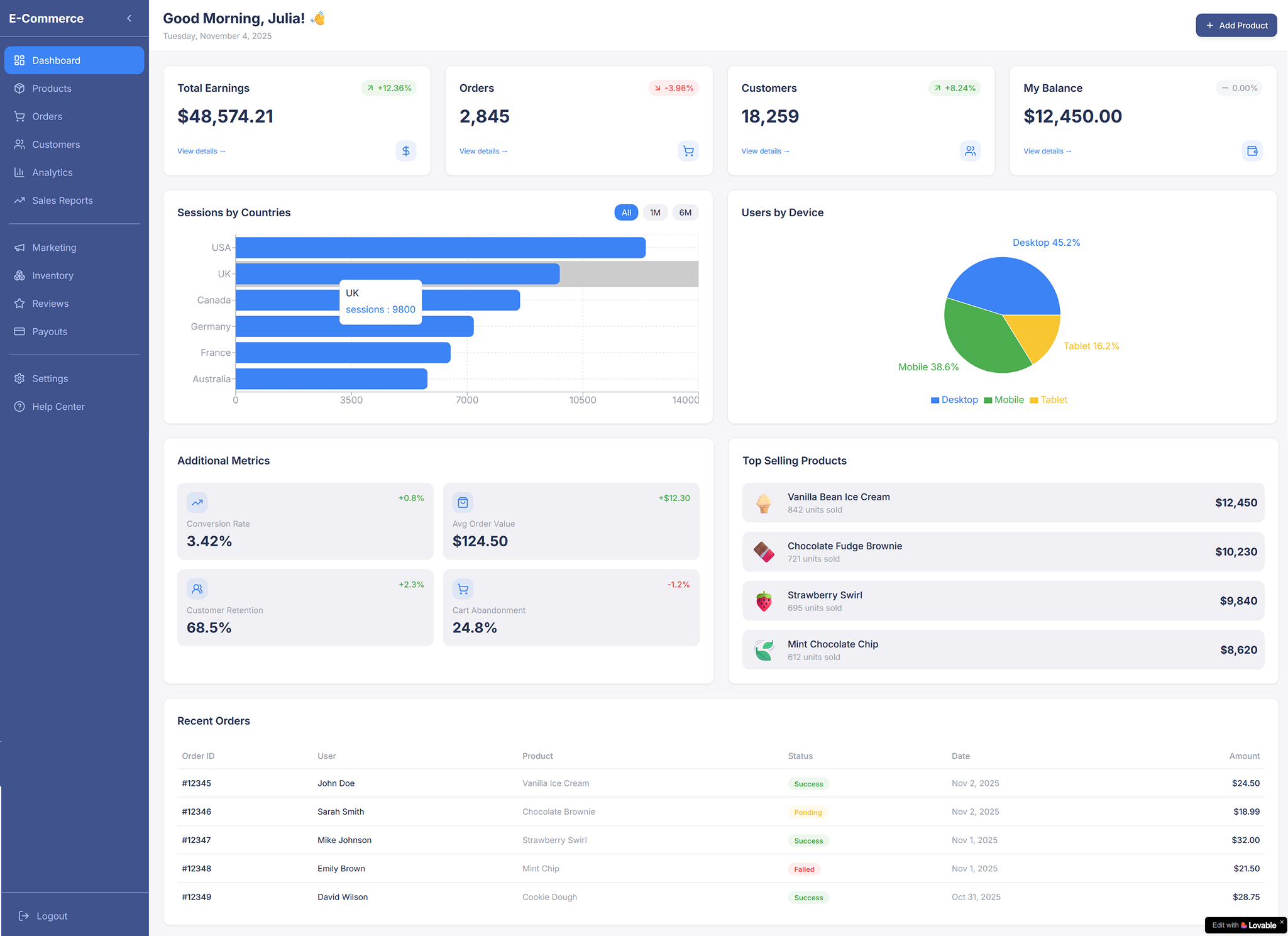 This e-commerce dashboard design is created in a modern, clean, and dynamic style.