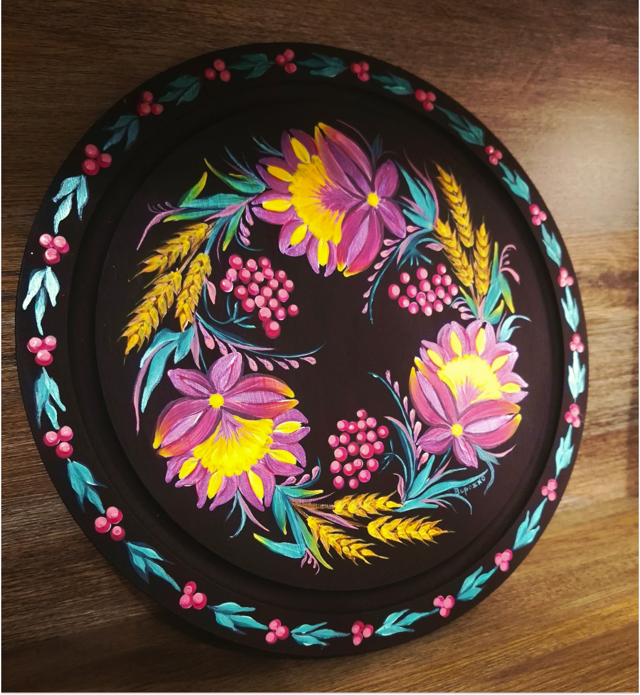 A hand-painted artwork in the traditional Petrykivka style, created on a round wooden board using acrylic paints on a dark background. Metallic acrylic highlights accentuate selected lines, adding depth and luminosity. The composition unites viburnum, wheat, and imaginative floral motifs within a closed circle.